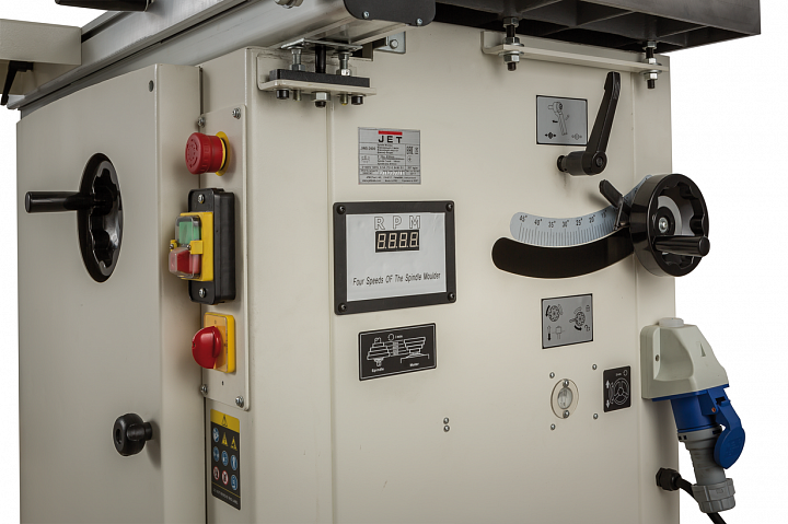 К особенностям Jet JWS-2600 нужно отнести: переключатель реверса, электронную световую индикацию скорости вращения шпинделя, возможность наклона фрезы на 45° «на себя» и на 5° «от себя», удобную легко читаемую миллиметровую шкалу высоты установки шпинделя.