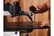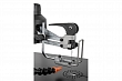 Станок оборудован параллелограммным механизмом привода качающейся части, имеющим ряд особенностей. Во-первых, верхняя часть рамы поднимается, что удобно при наладке или установке заготовки. В верхнем положении она фиксируется и не требует удерживания. Нижнее положение можно корректировать вращением рукоятки, подстраивая под длину пилки и толщину детали. Во-вторых, предусмотрен режим работы с продольной подкачкой полотна (так называемый маятниковый ход), который обеспечивает более «агрессивное» и производительное пиление. В зависимости от требований к скорости, точности и чистоте распила настраивают амплитуду продольных движений в диапазоне от нуля и до максимальной величины. Процедура выполняется поворотом моторного модуля вокруг оси.